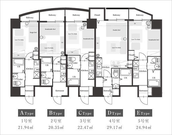 お部屋のタイプは、20m2~30m2までの5タイプをご用意。